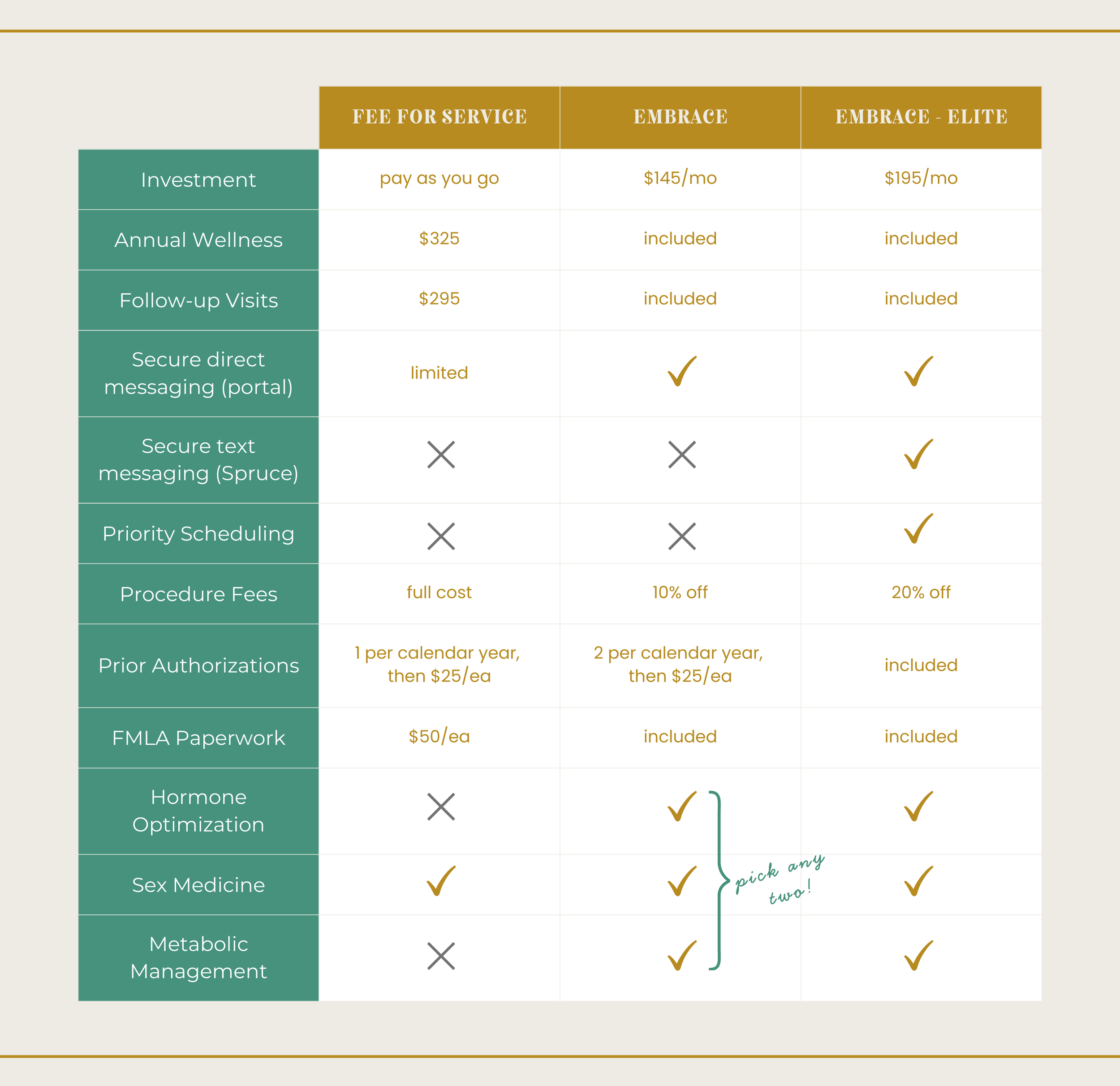 Please review the different membership options available (detailed below). Natalie will also discuss fee-for service options, if appropriate for your treatment plan.